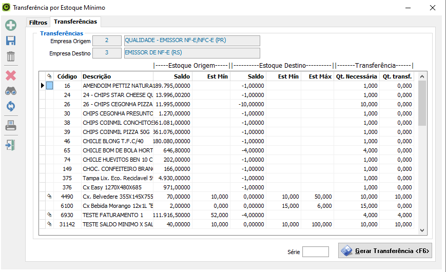 A nova tela MNF036 – Transferência por Estoque Mínimo centraliza todo o processo: nela é possível consultar os itens que precisam ser repostos conforme saldo da empresa de destino e disponibilidade da empresa de origem.