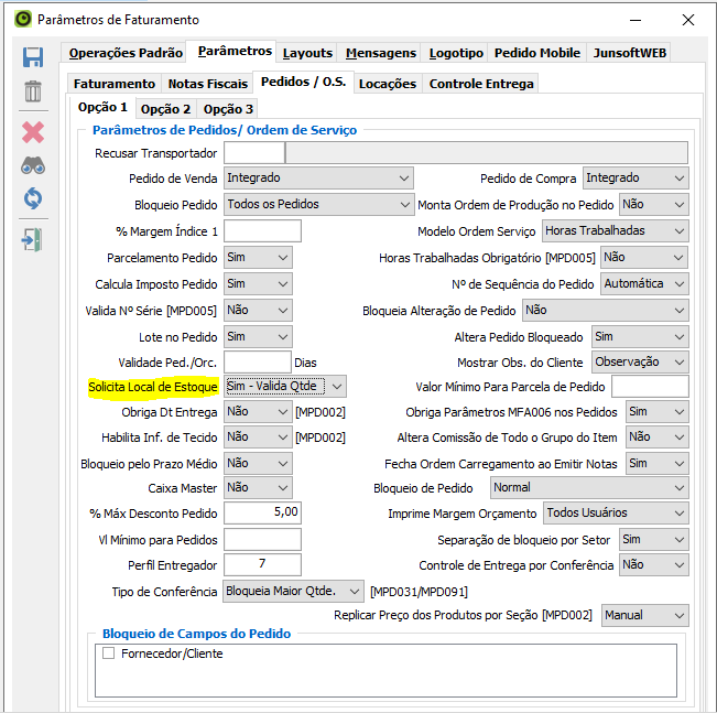 Para ativar, basta acessar a tela MFA001 (Parâmetros de Faturamento) e, na aba Parâmetros > Pedidos/O.S > Opção 1, selecionar a nova configuração "Solicita Local de Estoque = Sim - Valida Qtde".
